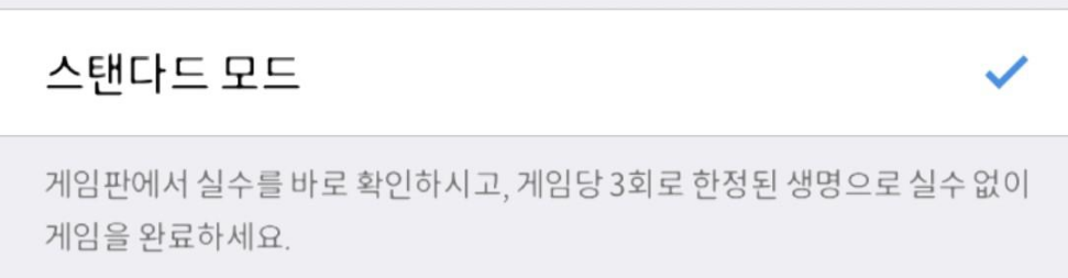 '스탠다드 모드'는 하드 3개가 주어지며 실수를 하면 하트 1개씩 차감되며 0개가 되면 게임오버가 됩니다.