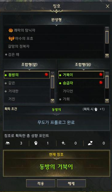 프롤로그가 끝나고 칭호를 주길래 바로 장착해보았습니다. 두 단어를 조합해서 칭호를 만들 수 있는 방식이더라고요.