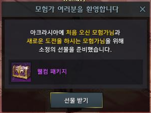 인벤토리를 열어보니 '웰컴 패키지'를 주더라고요.