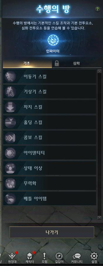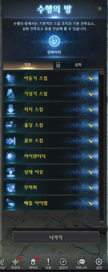 전직 후 바로 수행의 방으로 가게 되는데, 바로 나갈수도 있긴 한데