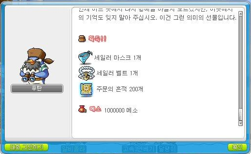 망토, 얼굴장식과 100만 메소 그리고 팔찌도 줍니다.