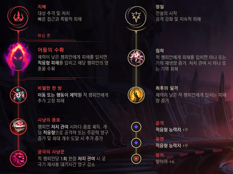 궁극의 사냥꾼으로 궁극기 쿨타임을 최대한 줄여주도록 하고, 최후의 일격과 최후의 저항 중에 취향에 맞게 가줍니다.
