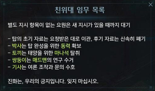 최근 기술관 카인의 행동이 수상하다고 하는데 이렇게 자신의 친위대 임무 목록을 입수했습니다.