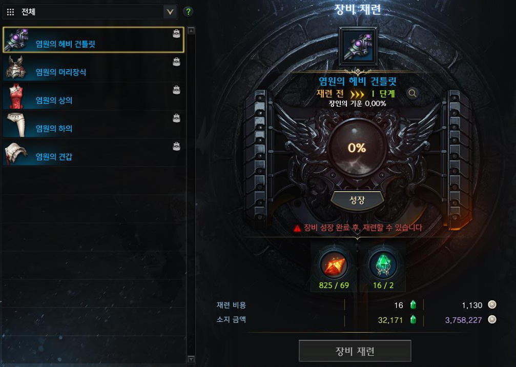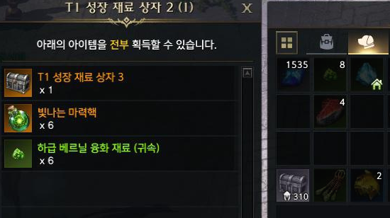 그렇게 계속 재련을 하다보면 템 레벨을 조금씩 오르게 되고, 성장 재료 상자를 계속 열면서 재련을 하시면 됩니다.