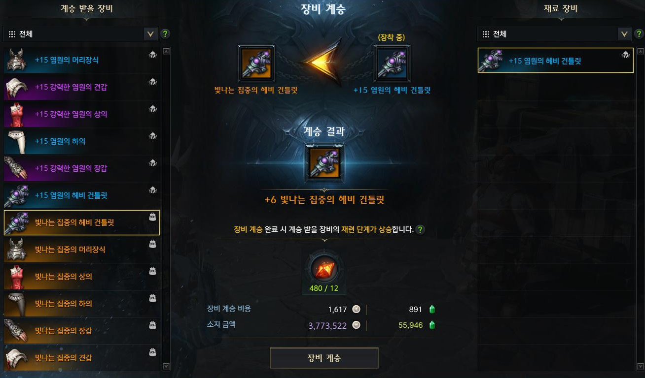그렇게 370레벨 장비를 모아서 기존에 사용했던 302레벨 장비들을 사용해 계승을 해주셔야 합니다.