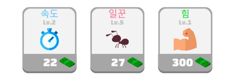 업그레이드 할 수 있는 것은 '속도', '일꾼', '힘' 이렇게 3개가 전부입니다.