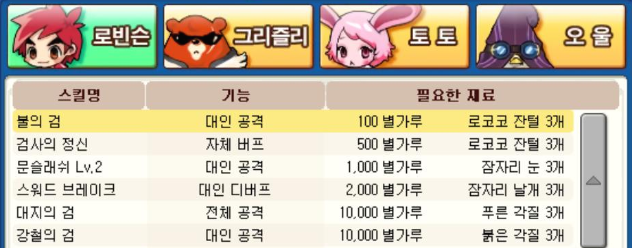 재료과 별가루를 모아서 스킬을 배우는 것까지 과거 기억과 그대로 나와있습니다.