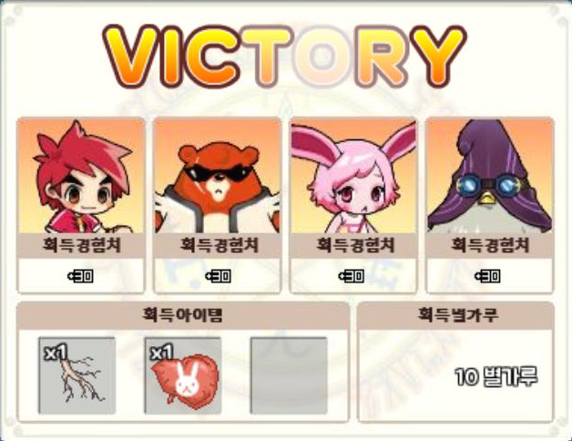 전투에서 승리를 하면 경험치과 별가루, 아이템을 얻을 수 있습니다.
