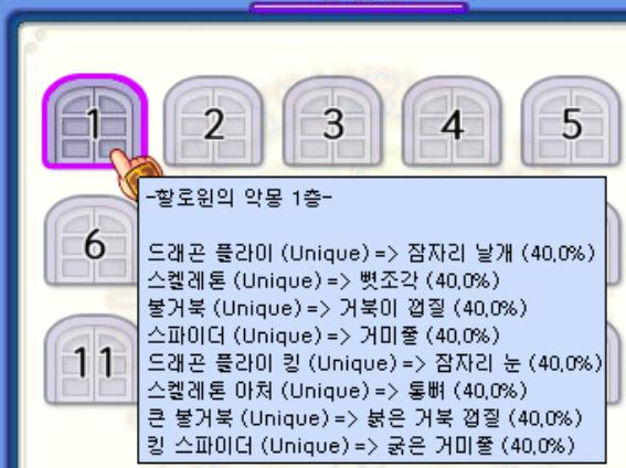 할로윈의 악몽 던전은 15층까지 있는데, 각 던전을 올라갈 수록 5층씩 늘어납니다.