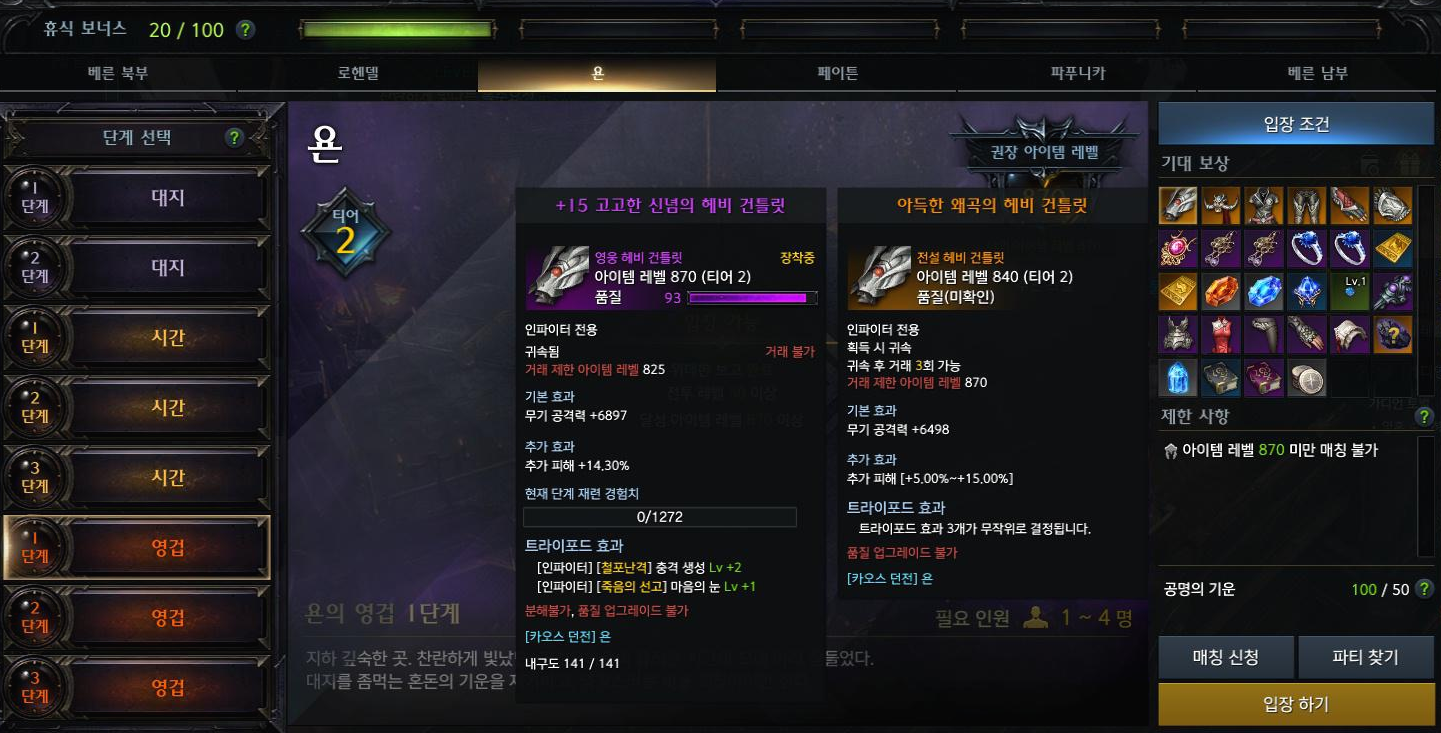 카오스 던전 영겁 단계를 돌아 840 레벨의 장비를 또 파밍을 하셔야 합니다.