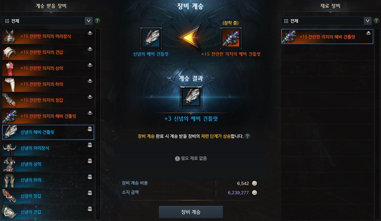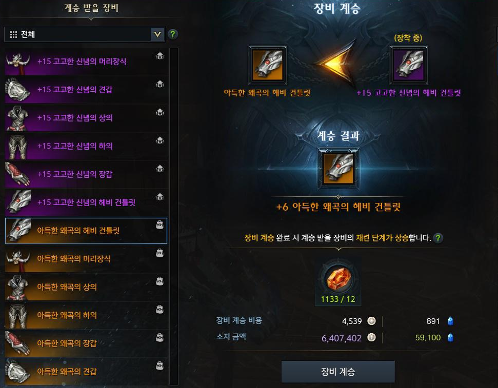 아까와 같이 장비 계승을 한 뒤에 계속 장비 재련을 하시면