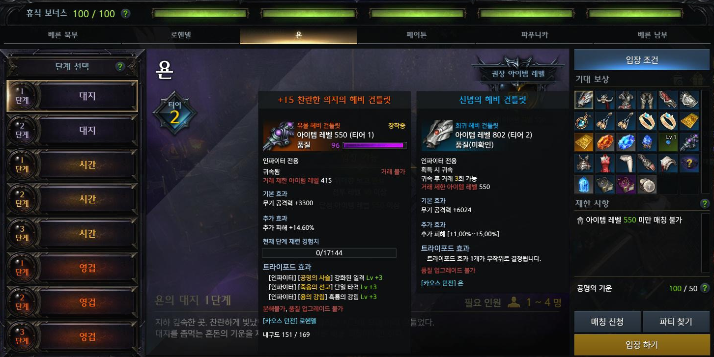 카오스 던전을 돌아 장비들을 얻은 다음 기존에 입었던 장비들을 사용해 계승을 해줍니다.