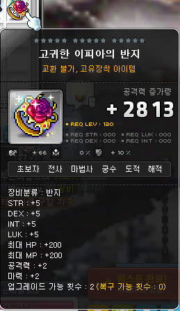 이런식으로 '고귀한 이피아의 반지'를 얻을 수 있습니다. 레벨은 120제고 스타포드는 최대 15성까지 가능해서 초중반에 유용하게 사용 될 보스 장신구 입니다.