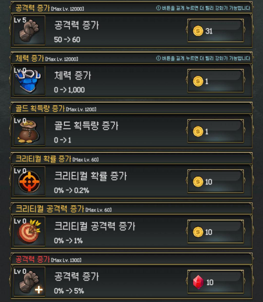 그리고 골드를 사용해 공격력, 체력, 골드 획득량을 통해 캐릭터를 강화를 시킬 수 있습니다.