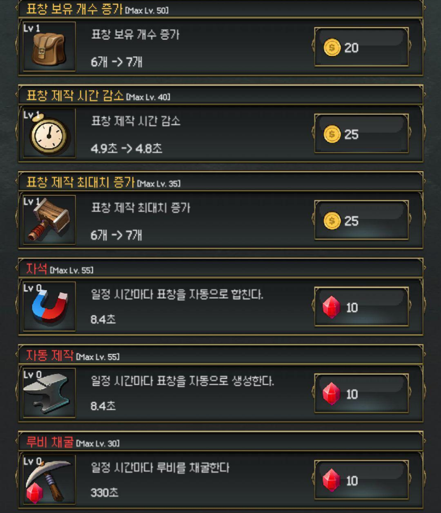 그리고 표창 보유 개수, 제작 시간, 최대치 등 표창도 강화를 할 수가 있습니다.