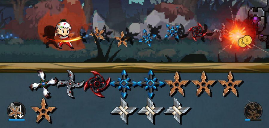 그리고 캐릭터는 가진 표창들을 단계 순으로 계속 던지며 몬스터를 잡고 골드를 획득하게 됩니다.