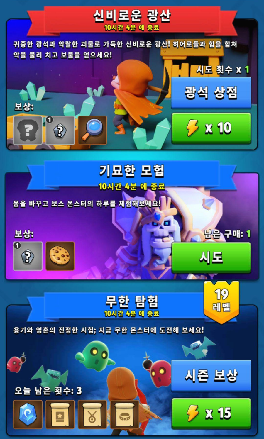 여기에는 적어두지 않았지만 히어로 모드, 원정 등 재화 파밍을 위한 노가다의 요소가 다양하게 있습니다.