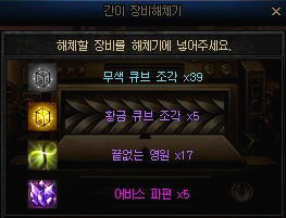 던전을 돌면 심연 장비들을 얻을 수 있는데 이 장비들을 추출, 해체를 통해서 황금 큐브 조각을 얻을 수 있습니다.