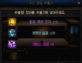연금술사의 추출기는 레벨에 따라서 생명의 숨결 개수 차이는 있지만 황금 큐브 조각 12개 고정으로 얻을 수 있습니다.