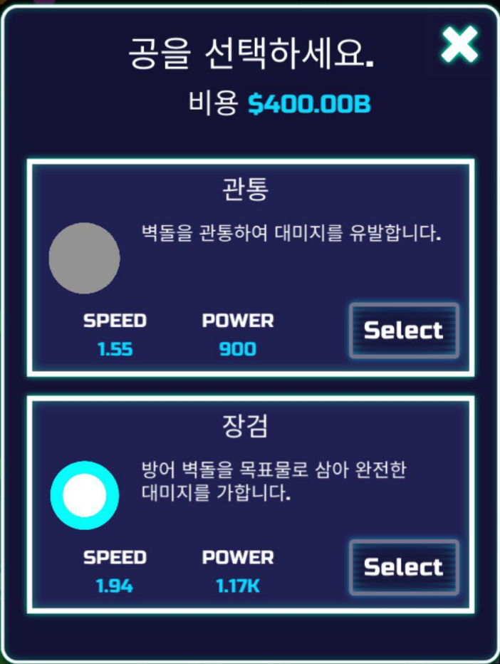 공의 개수, 속도, 위력을 업그레이드를 할 수 있습니다.
