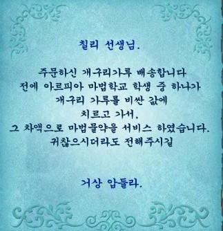 마법 재료실의 칠리 선생님이 주인공을 찾았다. 칠리 선생님은 항구마을 쥬다의 거상 압둘라가 주인공에게 줄 것이 있다는 편지를 보냈다는 것이다. 보니 저번에 다이아몬드 원석으로 개구리 가루를 산 것 관련으로 남은 차액으로 고급마법물약을 보낸 것이었다.