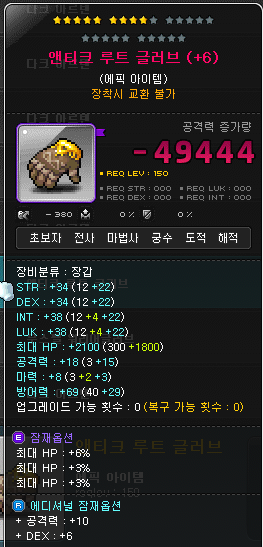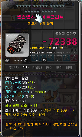 체력 2추옵에 공격력 5가 붙어있고 70퍼작이 되어있는 장갑입니다.