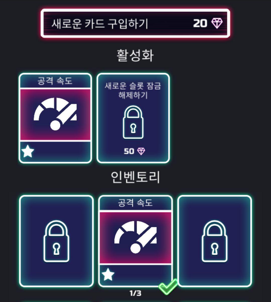 그리고 보석을 사용해서 타워의 다양한 요소를 업그레이드를 할 수 있는 카드를 모을 수 있습니다.