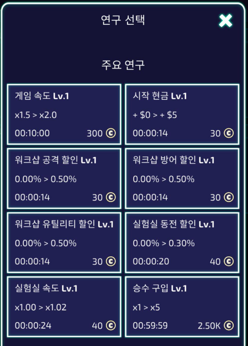 그리고 특이하게 '실험실'이라는 것도 있었는데, 위에 있었던 업그레이드의 배율을 올려주는 것도 있었습니다.