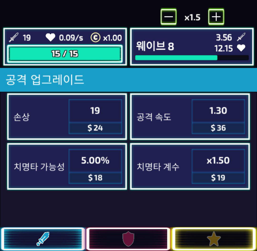 공격은 별다른 조작없이 자동으로 공격을 하며, 돈을 모아서 업그레이드를 할 수 있습니다.