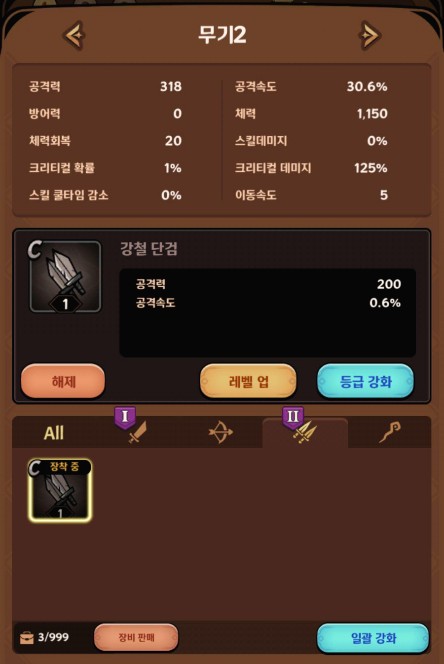 같은 등급 장비 3개를 모아 상위 등급의 장비를 획득 할 수 있습니다.
