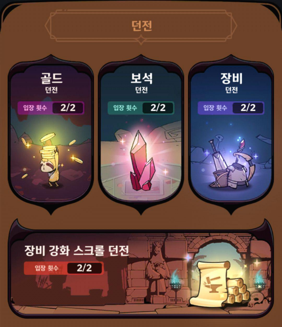'던전'에서는 각종 재화인 골드, 보석, 장비 그리고 장비를 강화해줄 스크롤을 얻을 수 있게 됩니다.
