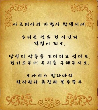 저번에 같이 갔었던 아론 선생님께 찾아가 편지를 보여주니 사막에서 봤던 사람들이 맞다는 말을 해줬다. 하지만 금단의 문 너머의 있는 사람이고, 금단의 문을 함부로 열 수 없기 때문에 도와줄 수 없다는 이야기를 들었다.
