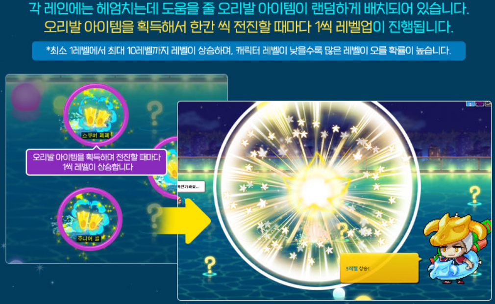 헤엄치면서 오리발 아이템을 먹고 전진할 때 마다 레벨업이 됩니다.