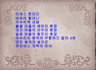 재빠르게 불꽃 마을의 에머리 촌장, 얼음 마을의 험프리 촌장, 아수리아 왕국의 무함마드 4세와 카디쟈, 데런 왕국의 세자르 3세, 큐리어스 저택의 큐리어스 마녀를 각각 찾아가 선물을 받을 수 있었다. 남은 인원 확인을 위해서 명단을 가장 아래로 내려보니 기욤의 이름이 쓰여있었다.