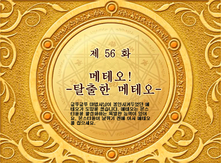 글루글루 마법사님이 봉인시켜두었던 메테오가 도망을 쳤습니다. 메테오는 몬스터들을 활성화하는 특별한 능력이 있어요. 몬스터들이 날뛰기 전에 어서 메테오를 잡으세요.