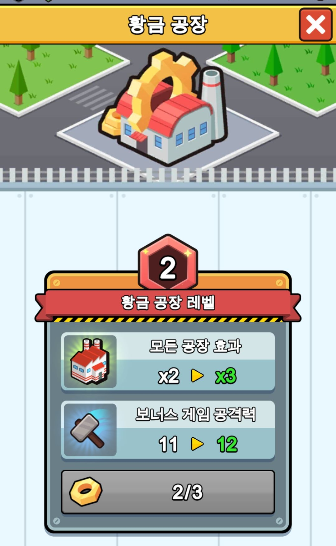 '황금 공장'은 각 스테이지의 모든 미션을 클리어하면 다음 도시로 넘어가면서 황금 너트를 얻을 수 있는데 이를 모아 황금 공장의 레벨을 올리게 되면 모든 공장 효과의 배수와 보너스 게임의 공격력을 상승을 시켜줍니다.