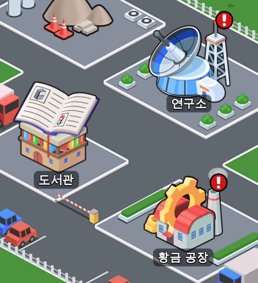 그 이외에도 '연구소', '도서관', '황금 공장' 이렇게 3가지 건물이 존재합니다. '도서관'은 지금까지 본 스토리를 다시 보거나 생산하는 물품에 대한 정보를 볼 수 있어서 사실상 관상용에 가깝습니다.