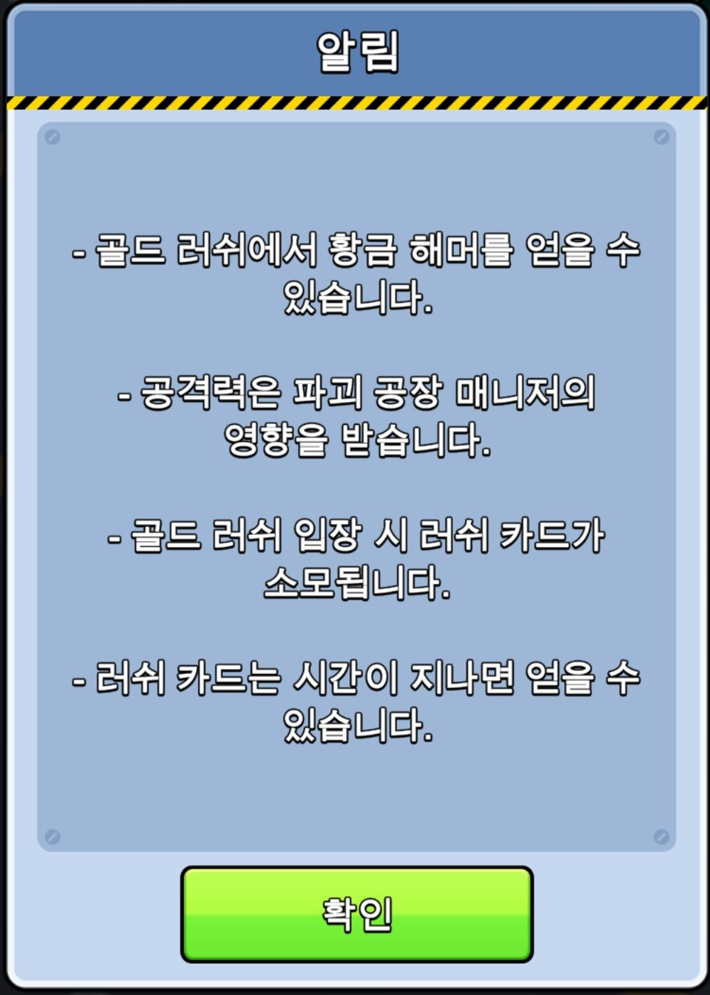 그리고 매니저의 레벨을 올려주기 위해서는 '황금 해머'라는 재화가 필요합니다. 하지만 이를 얻기가 그렇게 쉬운 편은 아닌데 '골드 러쉬'를 통해서 황금 해머를 어느정도 수급을 할 수 있습니다.