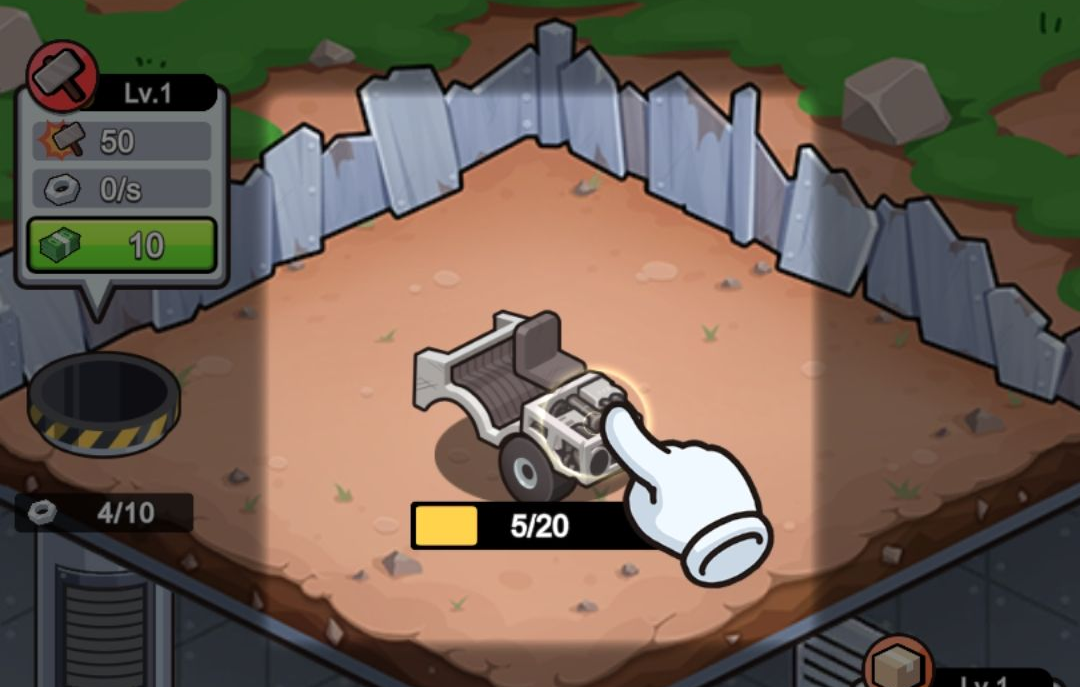 게임을 시작하게 되면 하늘에서 고철이 떨어집니다. 터치를 하면 고철에 대미지가 들어가면서 체력이 깎이며 고철을 얻을 수 있게 되고 이를 판매하며 수익을 올립니다. 돈을 벌어 각 라인의 레벨을 올려 라인의 효과를 더 올릴 수 있습니다.