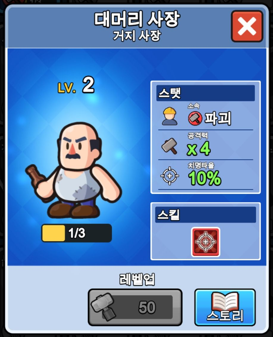하지만 이 모든 일들은 수동으로 돌아가지는 않습니다. '파괴', '생산', '판매' 각 라인마다 '매니저'를 배치를 할 수 있습니다. 각 라인에 맞는 매니저는 가지고 있는 스킬에 따라 효과를 올려주기도 하고, 모든 것들을 자동으로 돌아가게 하는 능력도 가지게 됩니다. 다만, 매니저의 레벨이 낮으면 자동 적용이 풀리기도 하기 때문에 레벨을 올려주는 것이 중요합니다.
