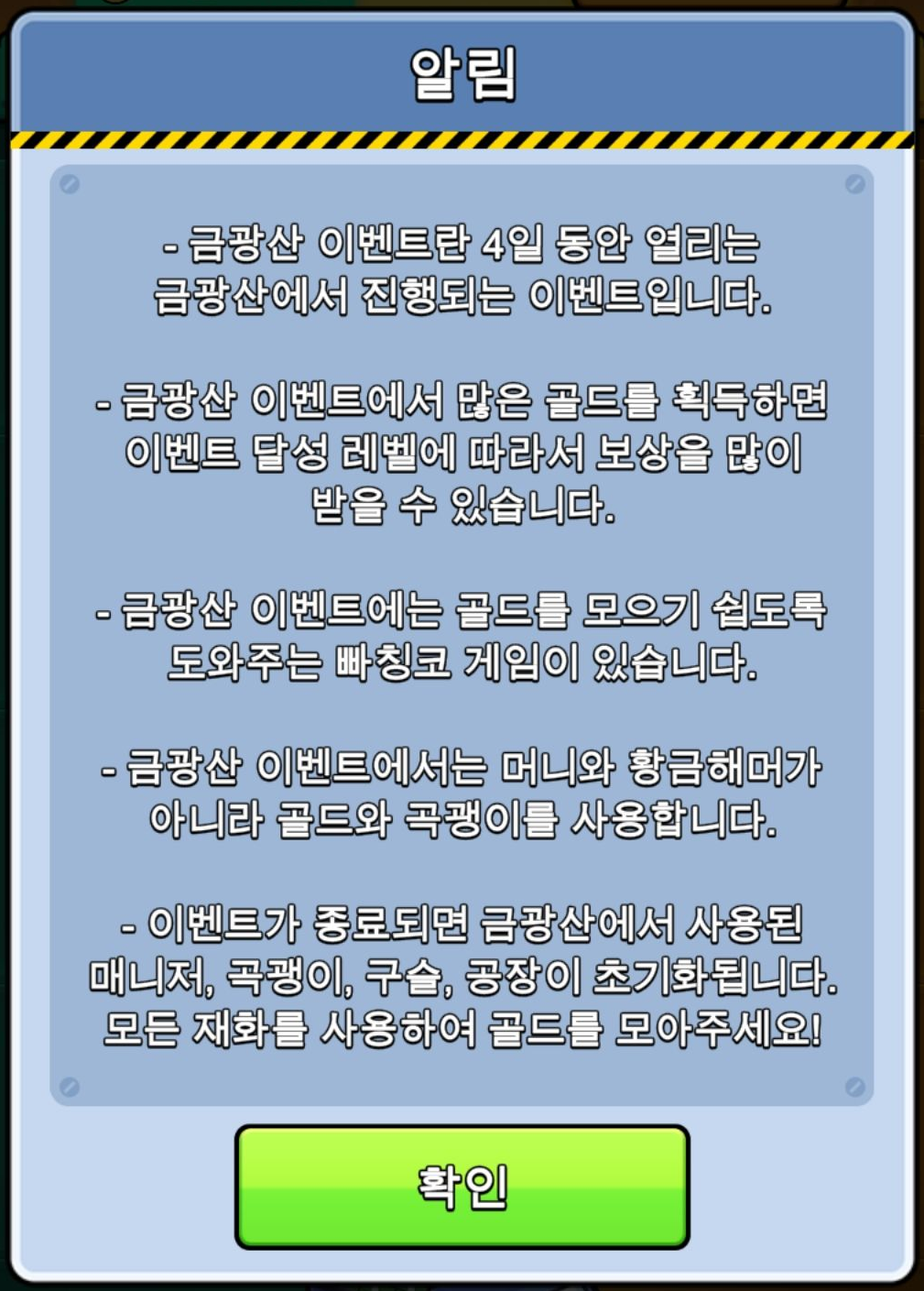 그리고 '금광산 이벤트'를 통해서도 재화를 획득할 수 있게 되는데, 기간제로 열리는 다른 광산에서 처음부터 다시 시작을 하게 됩니다. 거기서 번 돈의 양에 따라서 본 스테이지로 넘어가는 재화가 더 늘어나게 됩니다.
