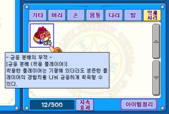 그리고 상점에서 '균등 분배의 부적'을 구매해주었습니다. 착용을 하면 쓰러져도 경험치를 균등하게 나눠서 획득을 할 수 있어서 좋습니다. 여기서부터는 지금보다 캐릭터가 쓰러질 일이 더 많아지기 때문에 무조건 있어야 하는 아이템입니다.