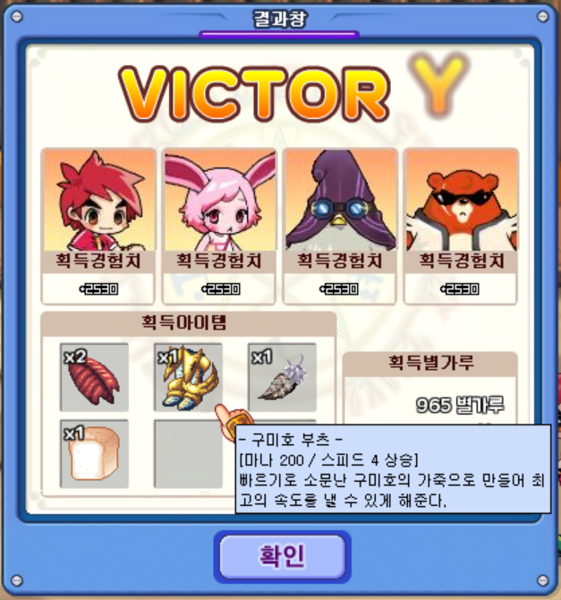 그렇게 에이션트 구미호를 잡는데에 성공했습니다. 보스 아이템으로 '구미호 부츠'를 얻었는데, 마나도 같이 있어서 당분간 사용하기 괜찮을 듯 싶습니다.