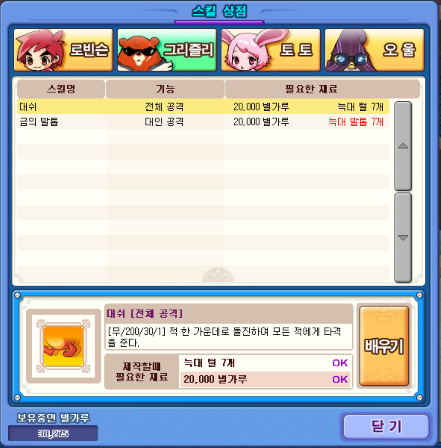 그래도 오울이 가진 '구미호 소환'이 전체 공격이고, 속성 상성도 나름대로 잘 먹히는 구간이라 노가다 자체는 크게 어렵지 않습니다. 이쯤되면 로빈슨은 '대지의 검', 그리즐리는 '대쉬'라는 전체 공격을 각각 가지게 되니 말이죠.