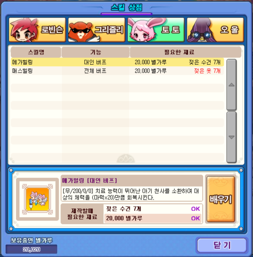 재료와 별가루를 모아서 남은 스킬들을 배웠습니다. 아직 마이크로 빌리지 던전을 클리어 하지 않았는데 스킬을 다 배웠다는 건 지금까지의 스킬로 버텨야 된다는 것입니다. 슬슬 고비가 오는 구간이 아닐까 싶습니다.