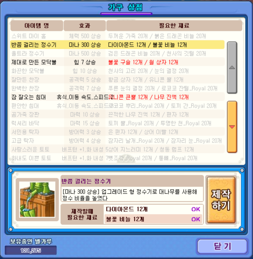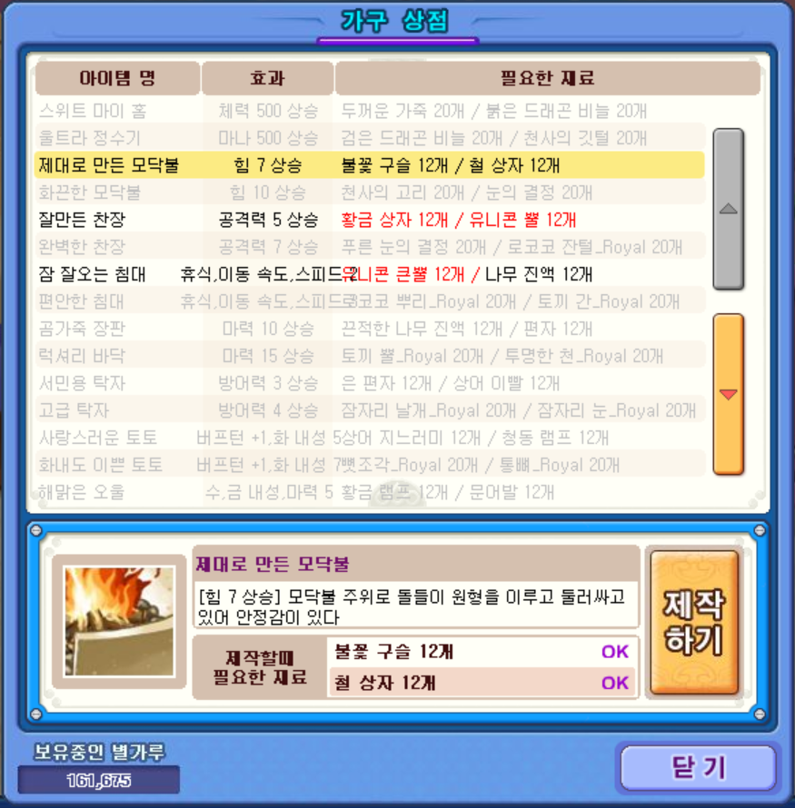 던전을 돌아주면서 나온 재료들을 모아서 가구를 제작을 해주었습니다. 캐릭터 스펙을 올려주는 방법으로는 제격이라 재료가 모일때마다 바로 제작을 해주고 있습니다.