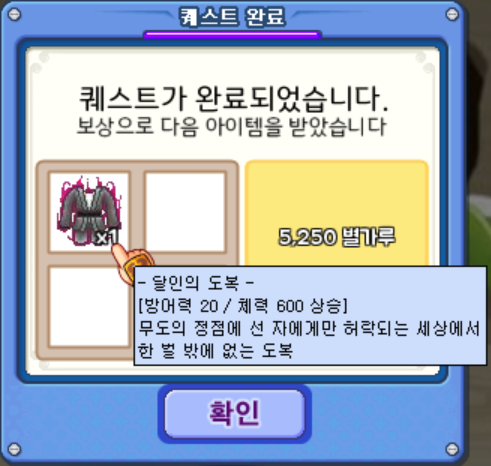 그리고 퀘스트 보상으로 '달인의 도복'도 얻었는데, 마이크로 빌리지에 파는 가장 비싼 방어구보다 성능이 좋아서 이것도 유용하게 잘 써먹을 수 있을 것 같습니다.