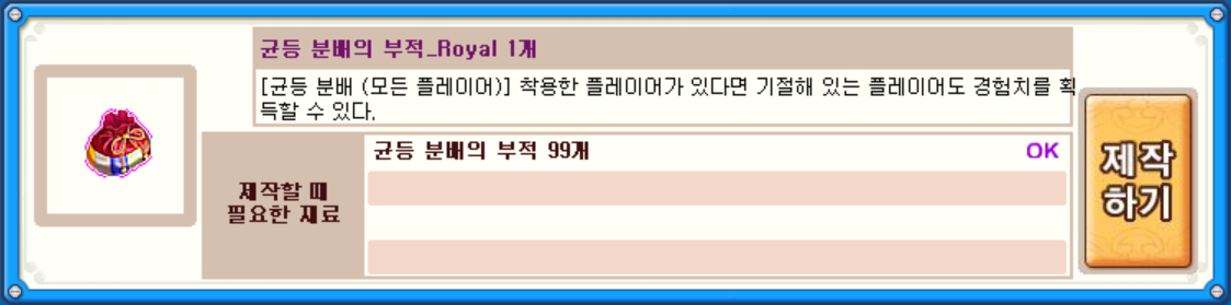크루소 빌리지에 있는 장비 조합을 사용 하면 '균등 분배의 부적' 99개를 사용해서 '균등 분배의 부적_Royal'을 제작을 할 수 있습니다. 이렇게 되면 캐릭터 각자 장착을 할 필요가 없고, 대표 한 명만 장착하면 모든 캐릭터가 효과를 누릴 수 있게 됩니다.