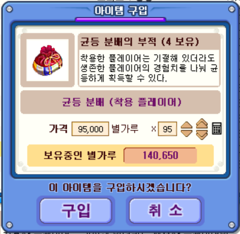 던전을 제대로 돌기 전에 하나 해야 할 일이 있었습니다. 저번에 구매했던 '균등 분배의 부적'을 95개 추가로 구매를 해주었습니다.