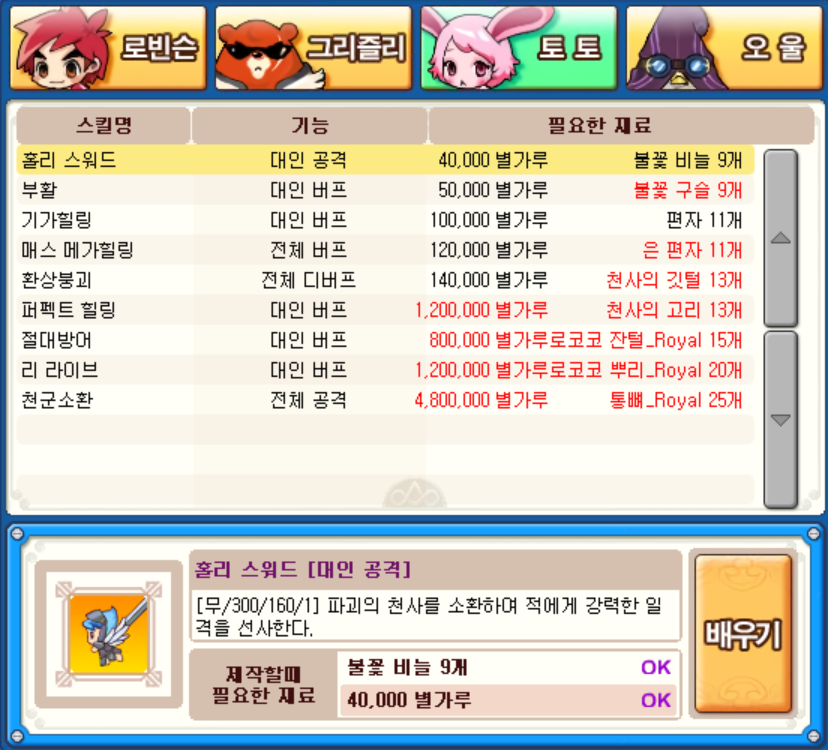 '홀리 스워드'가 단일 공격인게 살짝 아쉽지만 무난한 무속성에 꽤나 강력한 공격력을 가지고 있어서 이후 끝까지 자주 사용하게 되는 스킬이라 할 수 있습니다.